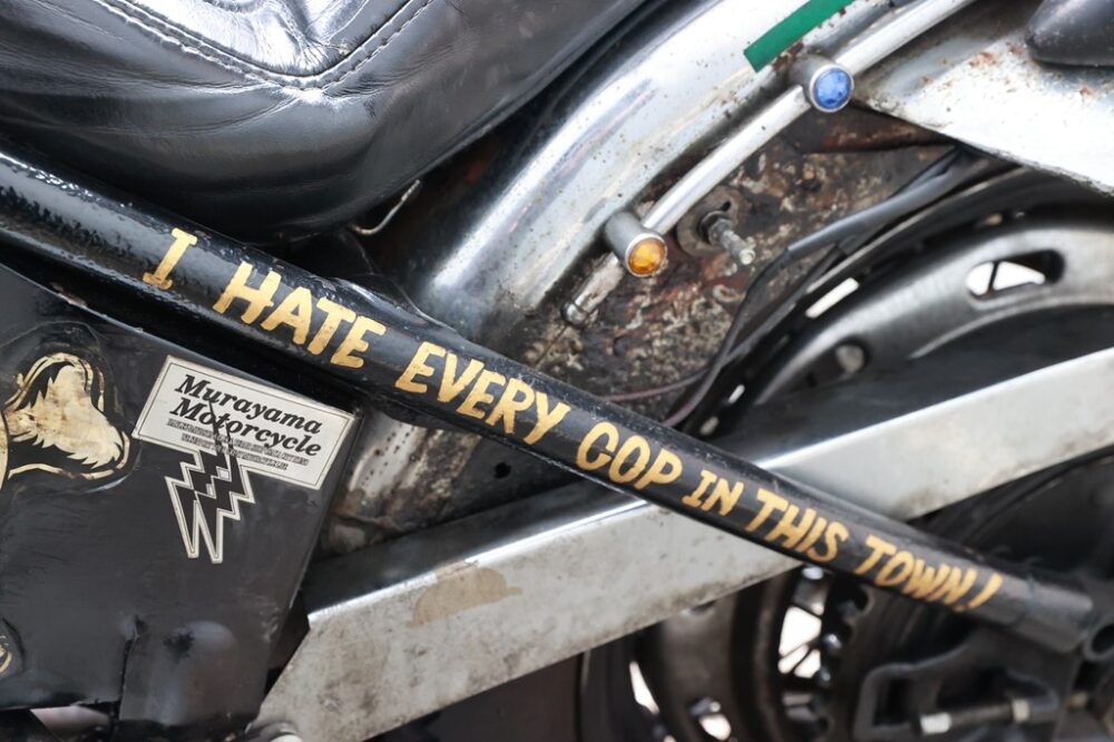 フレームのメッセージ『I HATE EVERY COP IN THIS TOWN!』は、バイカーらしいシャレが効いている。