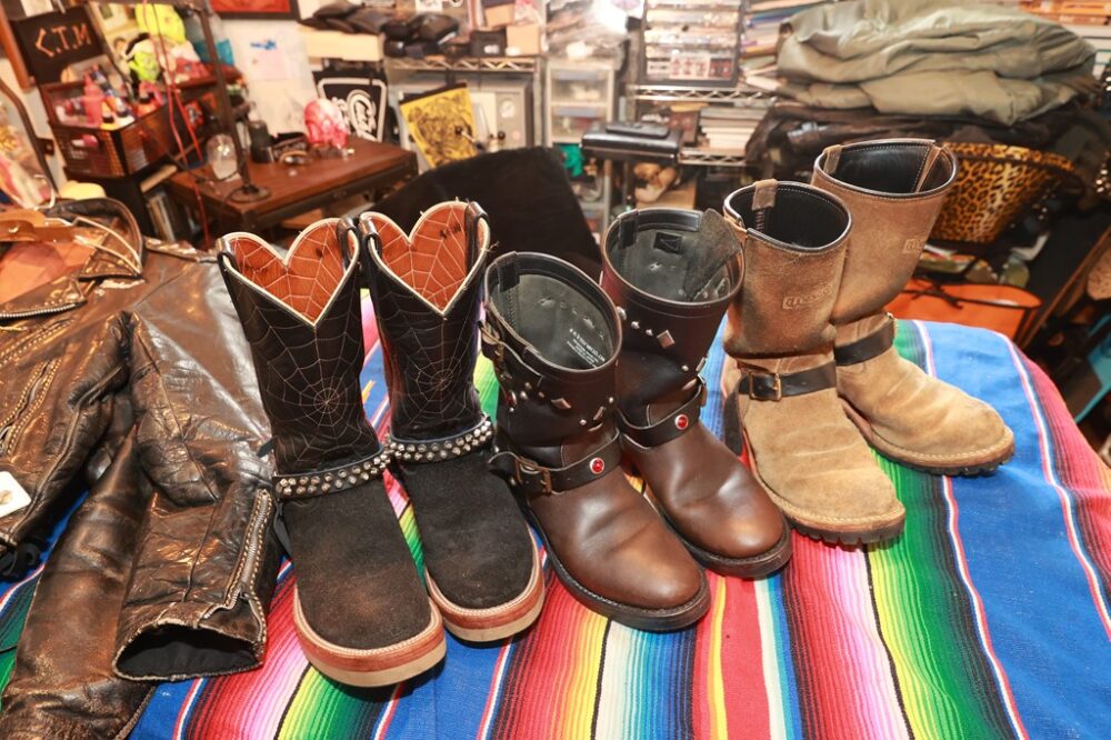 革バングルやブーツは必須アイテム。ブーツは50足ほど。ウエスコのスエードはバイク用。キーストンとWolfshead のダブルネームは普段用。