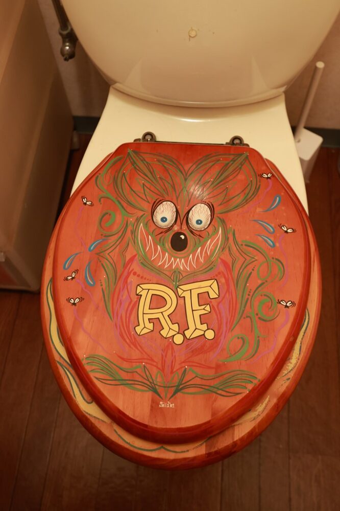 木製の便座カバーにピンストライプで描かれているのは、ホットロッド界の人気キャラクター、ラットフィンク。ソリッドさん作。