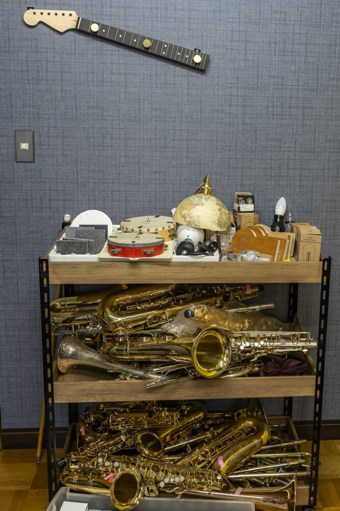 小太鼓はテーブル代わりに、フルートやサックスは照明のスタンドになった。管楽器はほかにもテーブルの脚として使われることも。