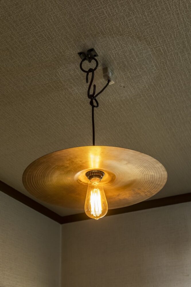 こちらもシンバルを使用。ペンダントライトは銅の風合いがとてもいい。タングステンなどオレンジ色の電球との相性も抜群だ。