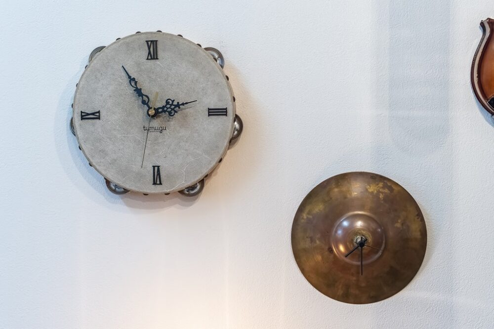 タンバリンやシンバルは掛け時計にアレンジ。使い込まれた状態がまたいい風合いを醸し出している。