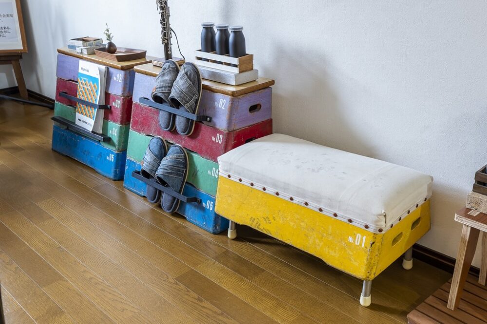 あえてペイントせずに汚れやキズをそのまま残した跳び箱をスツールとラックにアレンジ。ラックは半分にカットするとちょうどいいサイズに。