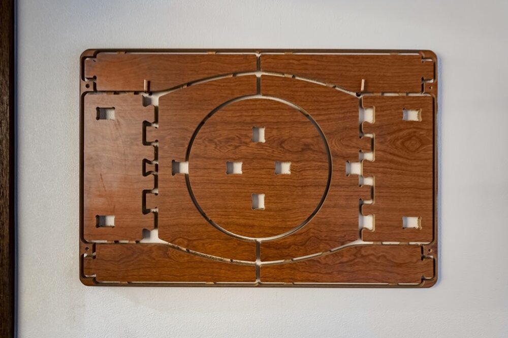 つながっている部分をカットして組み立てるとスツールができるというキット。元は学校の机の天板を使用。