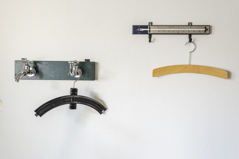 まさか蛇口をフックにしてしまうとは! 壁から蛇口が出ているのは少しびっくりするが、ユーモアがあって暮らしが楽しくなる。