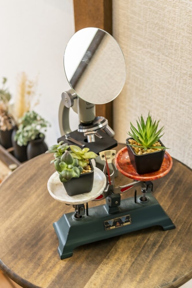 顕微鏡には鏡を付け、天秤はそのまま小物入れとして活用。アクセサリーや鍵などを置いてもいい。上下に動くのもなんだかほっこりする。