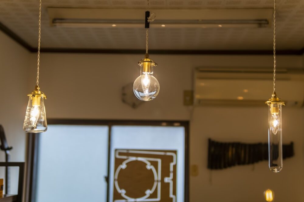 リシカツというブランドのビーカーやフラスコのペンダントライト。目盛りをそのまま残しているのも少年心をくすぐる。