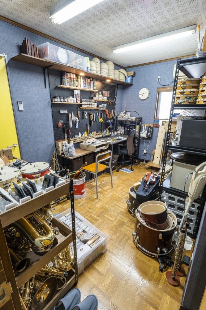 それを目の当たりにした土井健嗣さんが、どうにかしたいと思いついたのがインテリアへのアップサイクルだった。そのアイデアは奇想天外。管楽器を照明のスタンドにしたり、跳び箱をラックにしたり。土井さんがアイデアを出し、手先の器用な代表の裕美さんがカタチにする。いわゆる家族で作るプロダクツだ。金属の溶接や木材の扱いなど、素人では手出しできない作業は、近隣の職人さんたちが協力してくれているため、プロダクツとしてもかなりクオリティが高いのも注目されている理由のひとつだろう。