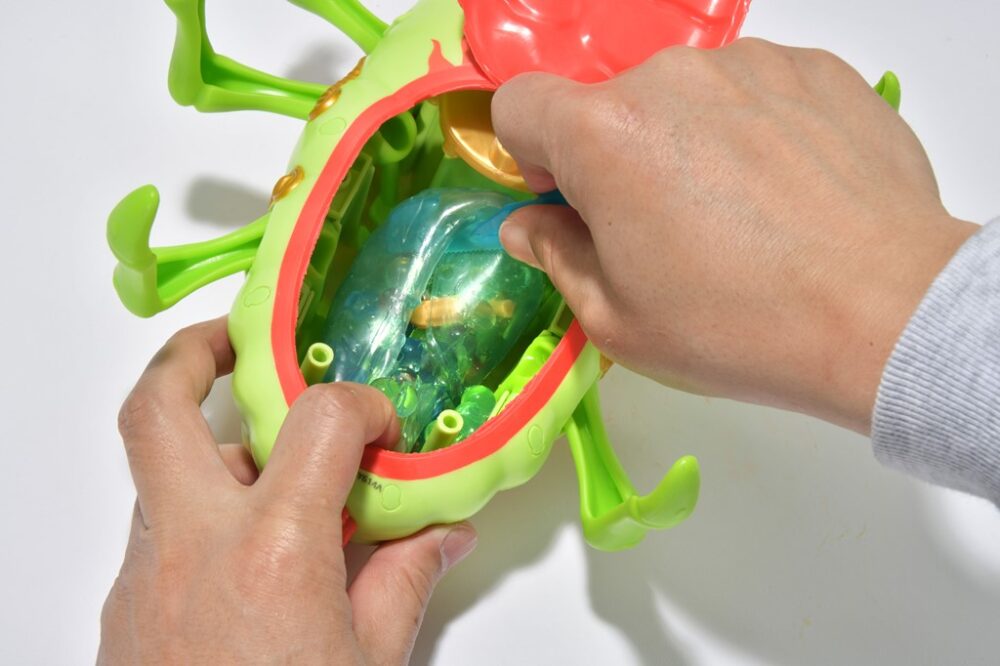 付属のプラ製ナイフでエイリアンの腹を切開する。ペロンと腹をめくると、骨格があり、その中にはブヨブヨの臓物らしものが2つあるのがわかる。