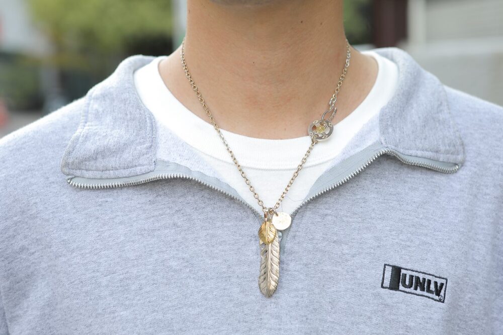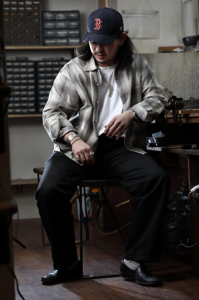 「niteklub」のシャツに「Losangeles Apparel」のTシャツを合わせて大人アメカジコーデ。パンツは「Schott×Dickies」、足元は「MOTO」のシューズを合わせてモノトーンに。アクセサリーはもちろん「ARIZONA FREEDOM」でコーデ。上のスウェットと微妙に組み合わせを変えているのがポイントだ。