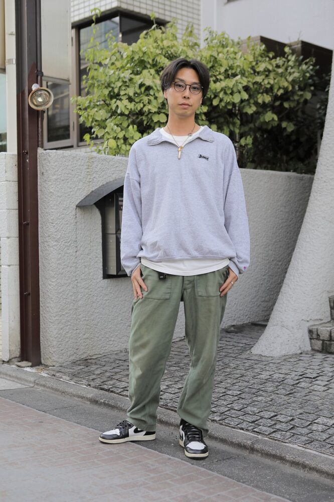ヴィンテージウエア好きでもある店長の佐藤さん。オールドミリタリーのベイカーパンツにハープジップのスウェットをコーディネイト。足元は定番のナイキ ダンク。