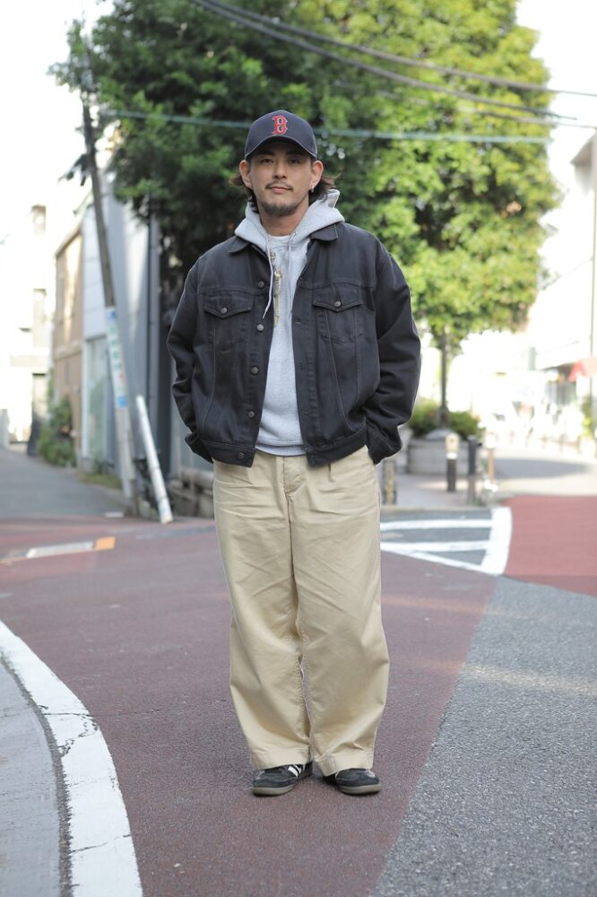古着で購入したリーバイスのジャケットはビッグサイズがお気に入り。パンツも極太シルエットで全体的にゆったりとしたシルエットでコーディネイト。