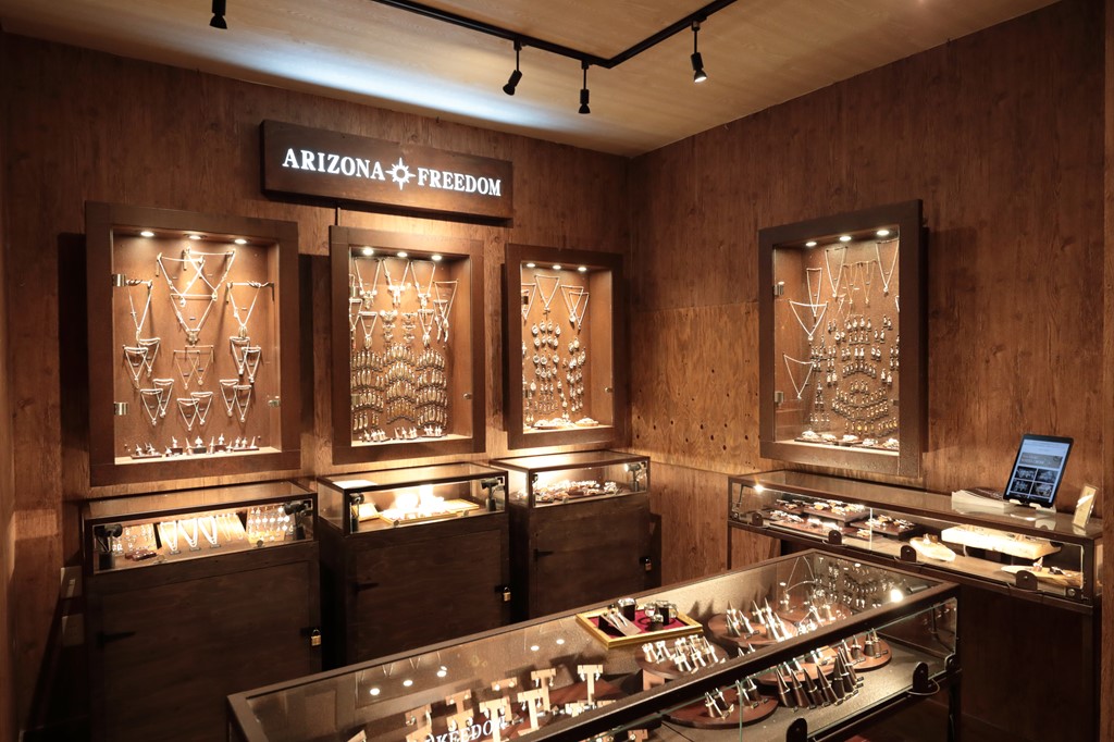 「アリゾナフリーダム」の直営店以外でショップインショップという形態で5店舗目となる茨城県は、ザ・ウォーリアーズの一角。北関東を代表するアメリカンカジュアルショップとして知られ、セレクトブランドの豊富さ、かつオリジナルレーベル、デルボマーズも展開し、ファッションとしてシルバージュエリーを取り入れる提案型のショップとなっている。