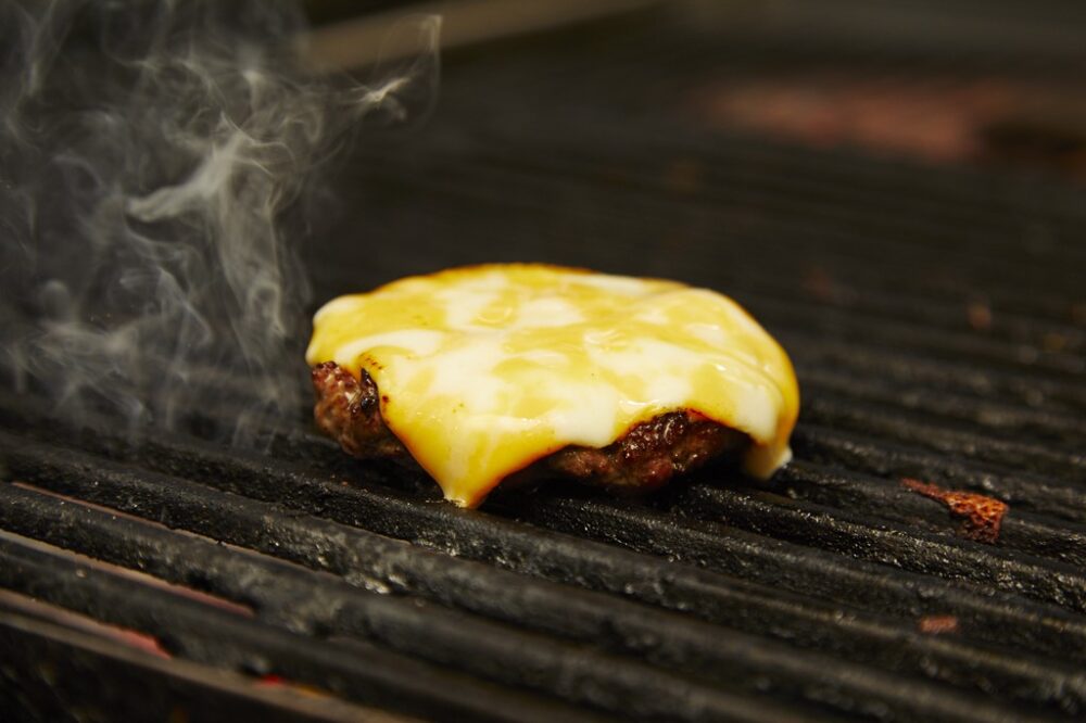 アメリカを代表するマーブルチーズに、こんがりと焼かれたパティのコンビネーションは、見た目にもたまらない。熟練した職人技でチーズをとろけさせている。