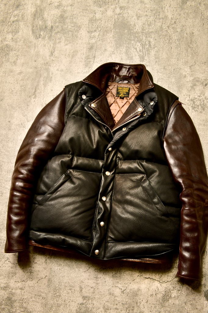 上の写真は、馬革製の茶ダブル(ファインクリークレザーズのレオン)に、鹿革のダウンベスト(ファインクリーク&コーの新作、LAW)を合わせたもの。革ジャン+レザーダウンベストは、言ってみれば米陸軍のECWCSのような“俺流”レイヤリングシステムなのだ。馬革と鹿革の素材感の違いが楽しめるのも、この重ね着のポイント。
