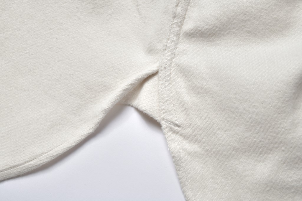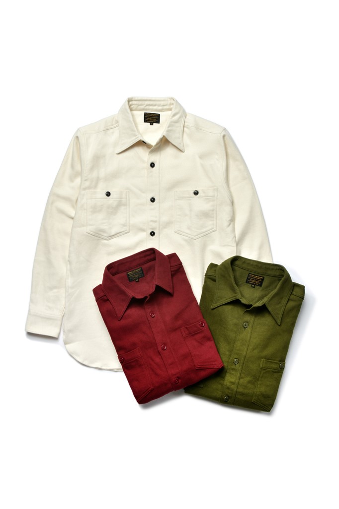 で、寒くなってくると出番が多くなるのがネルシャツの存在。もはやアメリカの服飾史(カジュアル服)において外すことができない大定番。最近では気分が1周したのか、ワーク系のいわゆるチェック柄のネルシャツが再燃(ド直球ってヤツね)もしているんだけど、じつはハズシで無地のネルシャツって無いものかといつも思っていた。柄の入ったアウターを着たい場合にチェック柄のシャツだとどうしてもケンカしちゃうからね。
