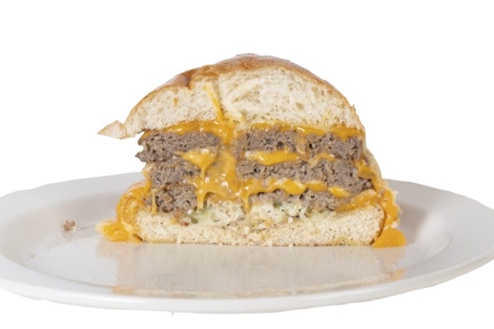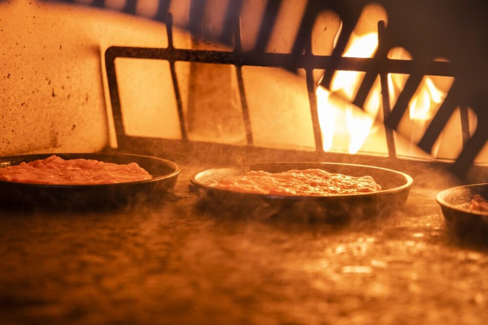 150gのパティ3枚と2種類のチーズを使用した濃厚かつボリューミーなハンバーガー。牛肉100%のパティ150gを3枚使ったボリューム感。ハンバーグを焼く石窯で、火の様子を見ながら焼いていく。3枚のパティの間にオセミハードタイプの酸味のあるステッペンチーズとチェダーチーズの2種をたっぷり使用。意外と重くなくぺろりと食べられる。