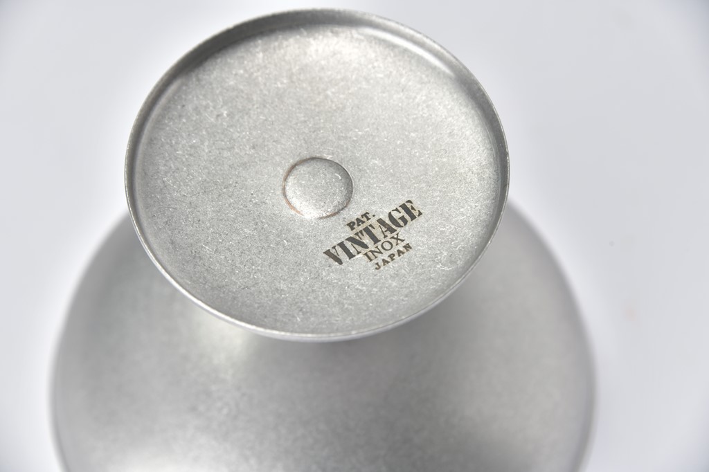 今号の特集である「ヴィンテージ」をキーワードにネットでいろいろと調べていたら、「ヴィンテージイノックス」なるブランドを偶然見つけた。ステンレスにダメージ加工を施した器やカトラリーを展開しており、シンプルで無機質な感じがとてもいい。
