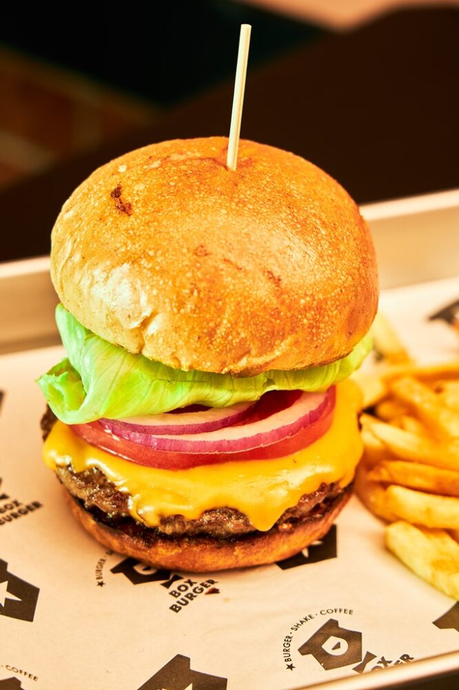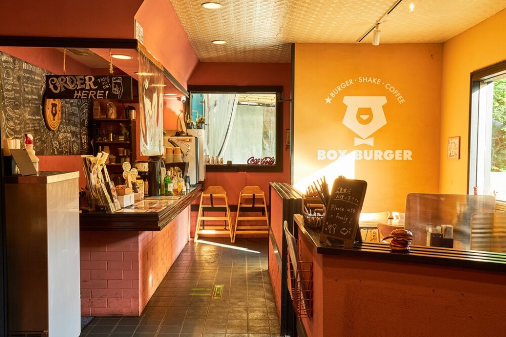極力地元の食材を使い、日本と海外をミックスした独自の“ニューアメリカンバーガー”。サンディエゴのレシピを参考にボックスバーガーならではの製法で丁寧に手作りしているバーガー。150gのつなぎなしのパティに、オリジナルの無添加バンズ、ソースはマヨネーズ、マスタード、ケチャップ、オリジナルスパイスなど、BOX BURGERならではの黄金比で構成。