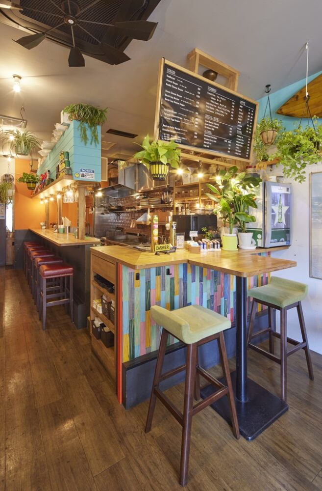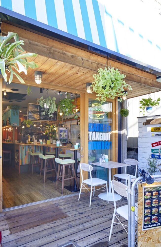 東武東上線の川越市駅から徒歩1分の好立地に、2022年4月にオープンしたグッドデイズバーガーは注目度の高い新生ショップだ。海の家をテーマにした店内はターコイズブルーを基調とした爽やかなデザインに観葉植物を随所に置き、カリフォルニアのような雰囲気を演出している。