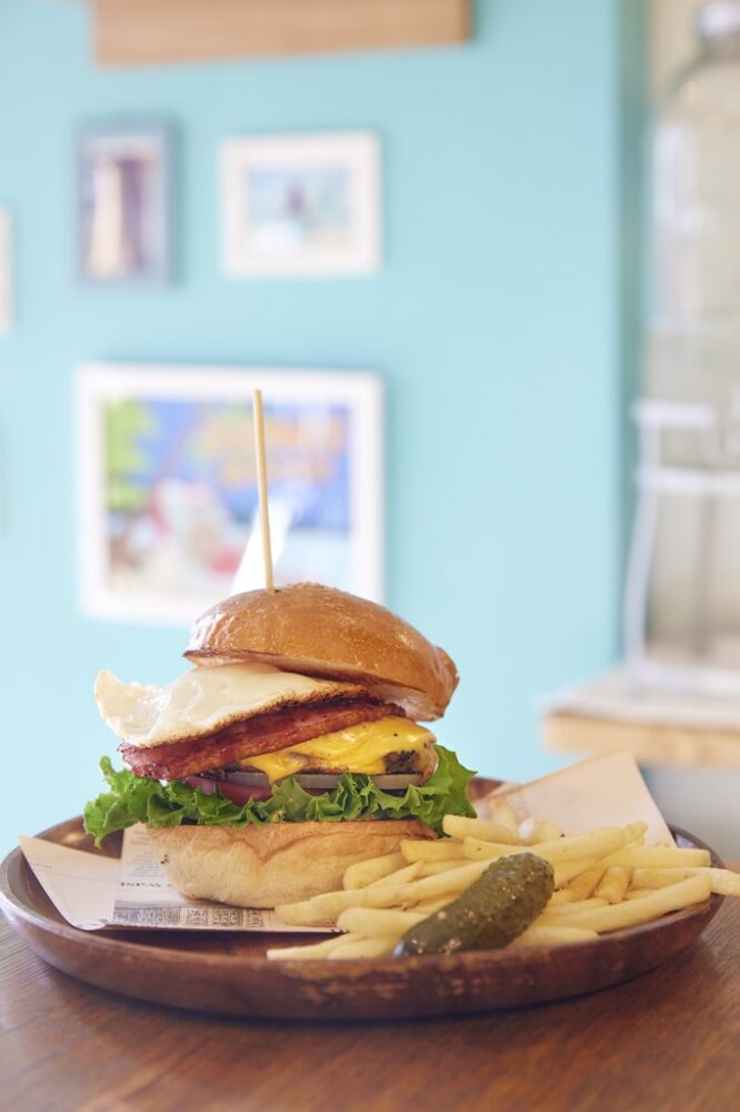 目玉焼きと厚めのベーコン、チーズが食欲をそそる。バンズやパティはプロにそれぞれのプロに製造をお願いし、野菜は地元の市場から。彩り、見た目のバランスがよいのが特徴だ。特製のBBQソースがこのお店の味といえるだろう。ポテトがセットで1300円。