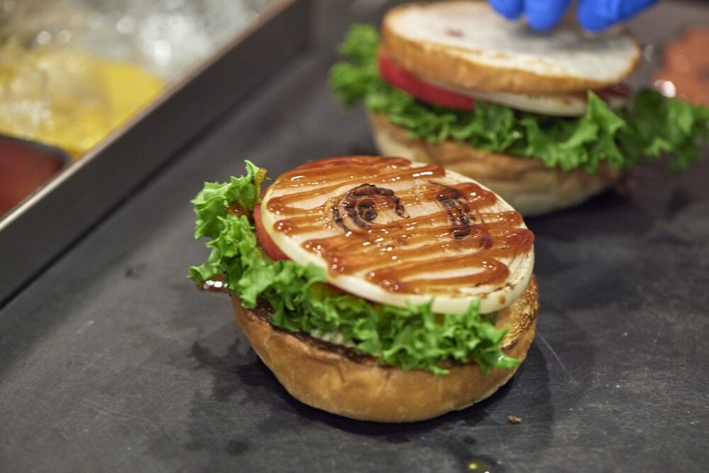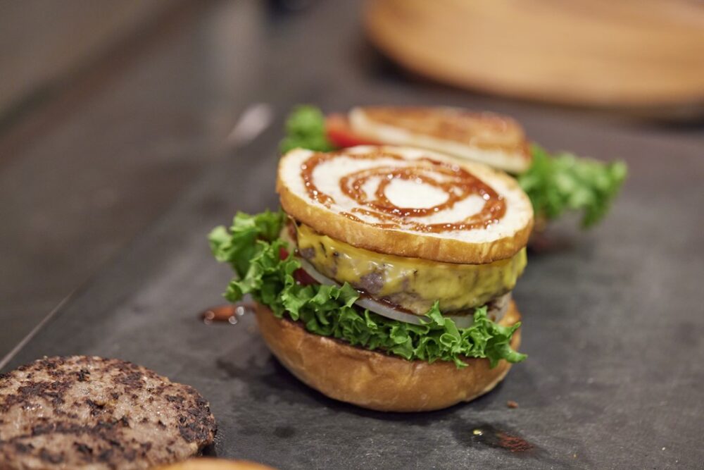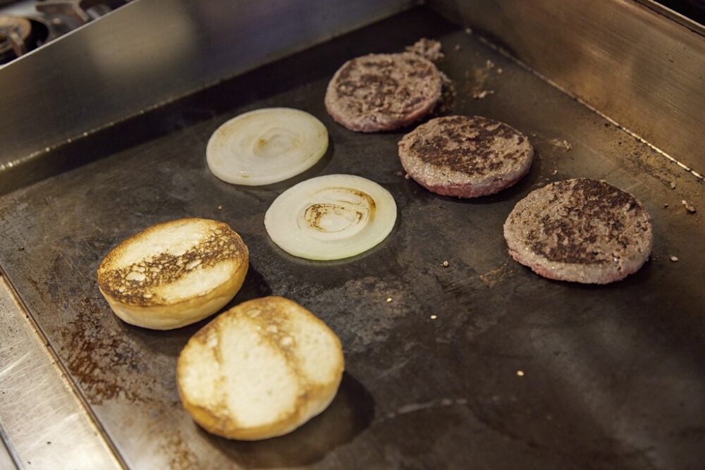バンズ、オニオン、パティをそれぞれ焼く。使用しているパティは表面を4分焼くのがちょうどいい。