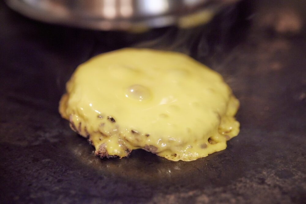 とろとろにとろけたチーズがパティを包み込む。鉄板に付いたチーズは少しカリッとさせることで異なる食感を楽しめる。