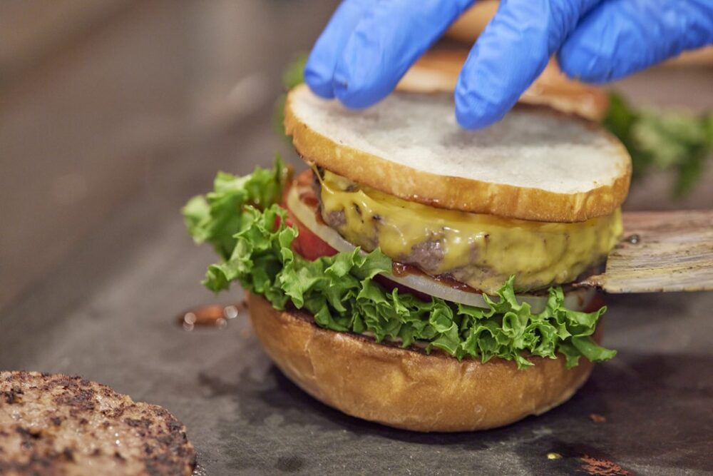 半分にカットしたバンズのクラウンの下の部分を少しカットして2枚のパティの間に差し込むのがグッドデイズバーガー流。