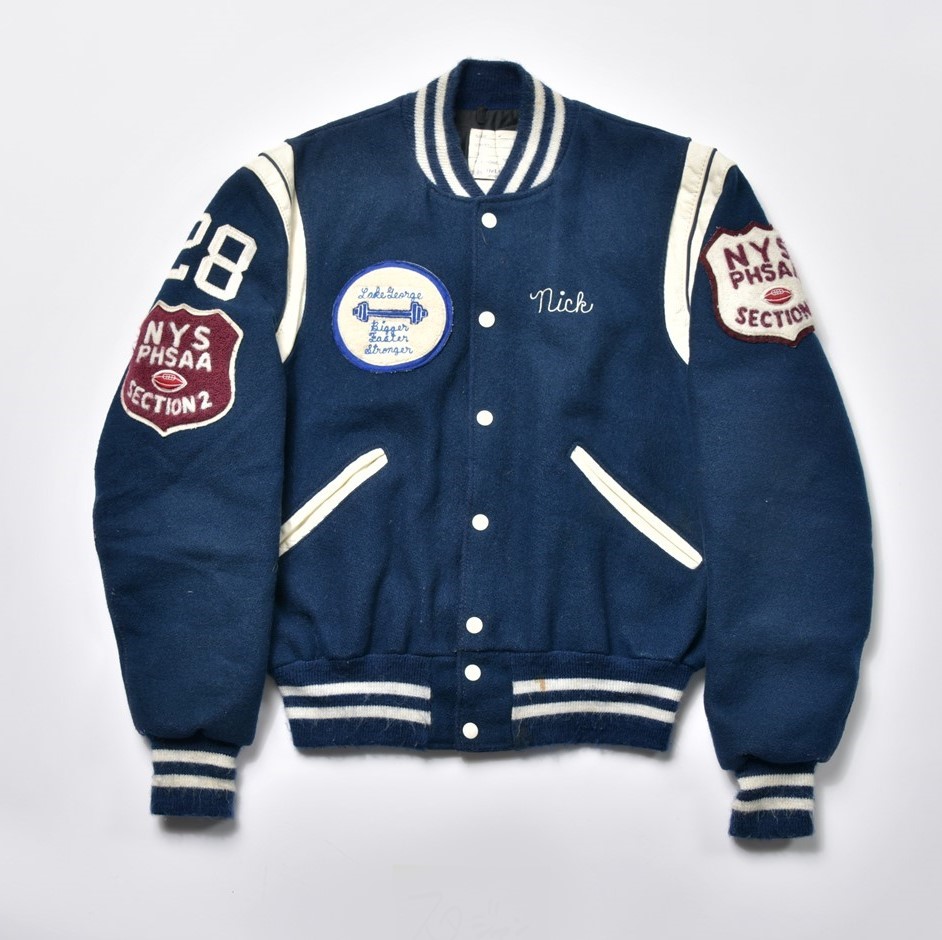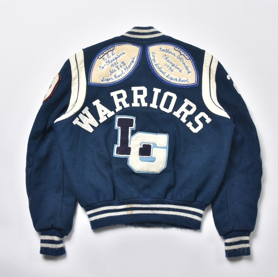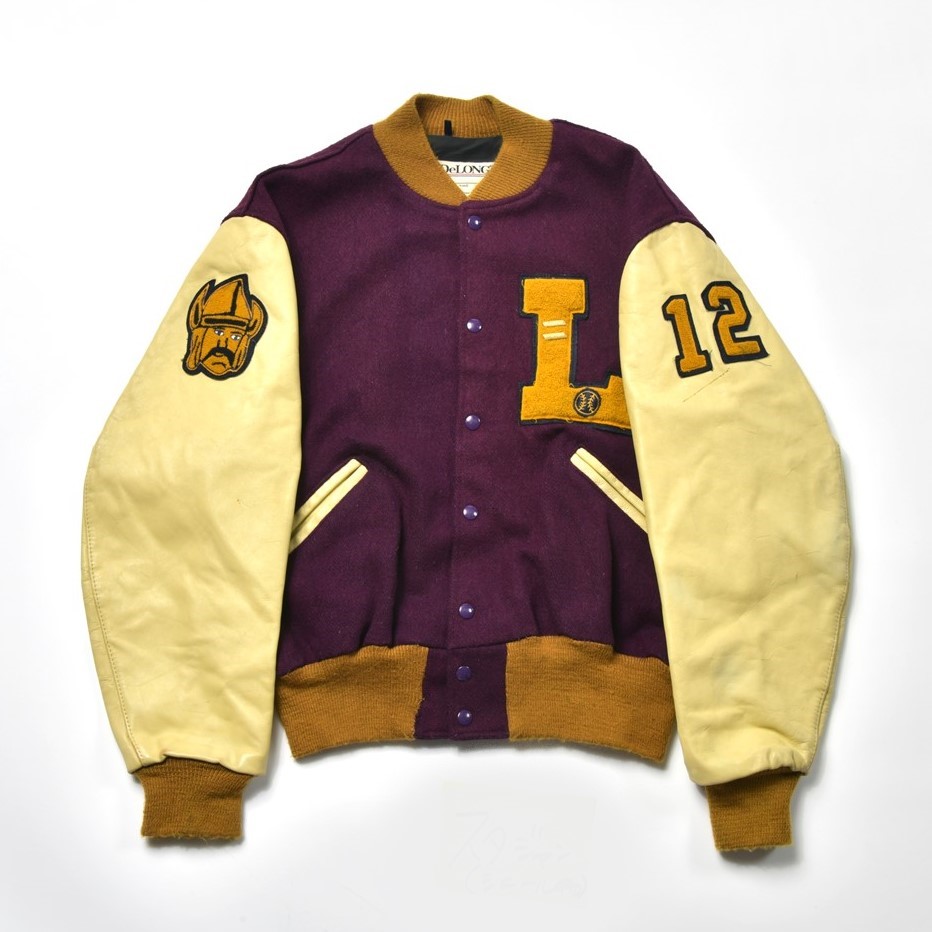’80年代のDeLONG製アワードジャケット。背面には1985年と1986年のフットボールチャンピオンのシニールワッペンをデザイン。セットインスリーブ部分にあしらったレザー素材のホワイトのダブルラインがアクセント。1万1880円(ロコ TEL03-5708-5398)