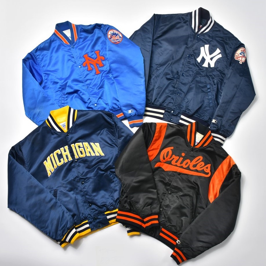 (左上)’80年代のスターター製サテンジャケットのニューヨークメッツ。ドジャースからメッツへ移籍した野茂英雄(’98年)やマック鈴木(’99年)、新庄剛志(’01、’03年)など多数の日本人選手が活躍。2万2000円(ドロップTEL03-3463-6086)(右上)’80年代スターター製のニューヨークヤンキース。伊良部秀輝(’97 ~ ’99年)や松井秀喜(’03 ~ ’09年)らが所属。3万800円(ドロップ TEL03-3463-6086)(左下)’80年代のスターター製ミシガン大学のサテンジャケット。1万9000円(デザートスノー ガーデン店 TEL03-5761-6390)(右下)’80年代スターター製のボルチモア・オリオールズ。1万4000円(デザートスノー ガーデン店 TEL03-5761-6390)