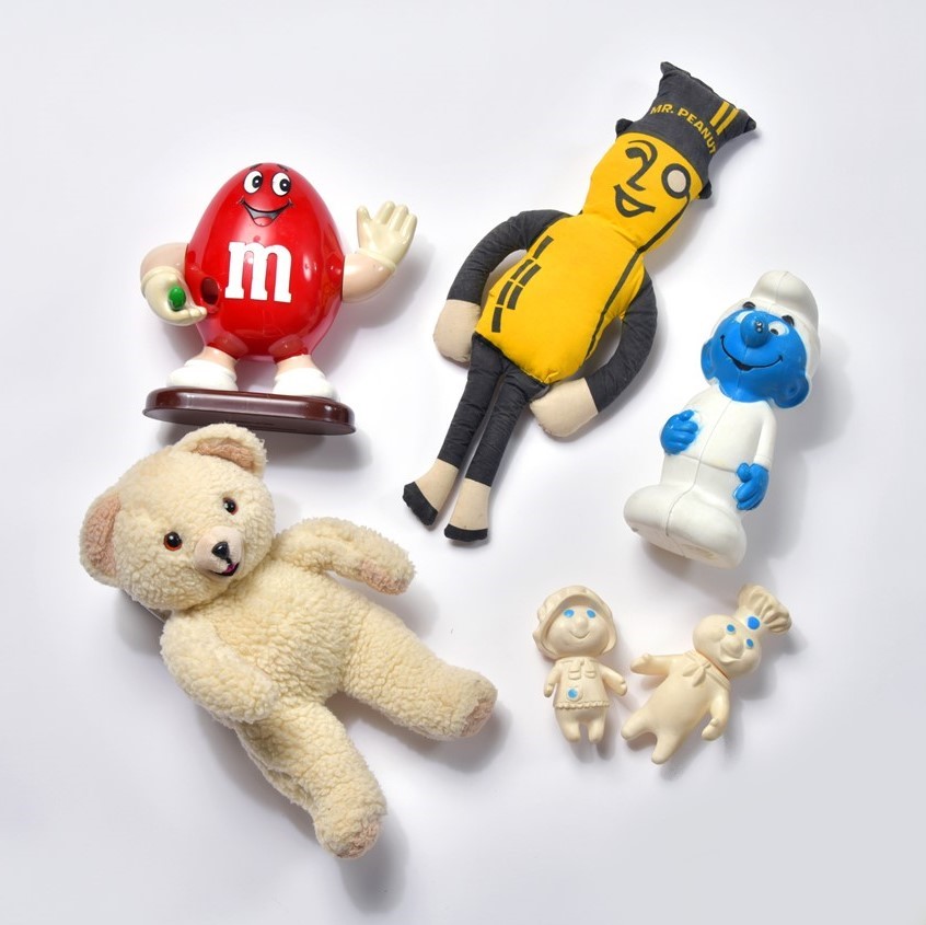(左上)M&M’sのキャラ「スポークスキャンディ」。2023年1月23日にM&M’sはスポークスキャンディを無期限で休止すると発表。’90年代製。7480円(ダンジル TEL042-720-8703)(右上)米国のプランターズ社が販売しているピーナッツ菓子のアドキャラ「ミスターピーナッツ」。だが、なんと2020年に104歳で死亡した(笑)。’70年代製。8580円(セカンドブーム TEL03-3462-1721)(右中)’80年代製スマーフのプラスチックバンク。4180 円( セカンドブームTEL03-3462-1721)(左下)柔軟剤のマスコット、ファーファは’90年代製。3500 円( サウンズグッド TEL03-5433-3758)(右下)’70年代製ポッピン・フレッシュと妻のポピー・フレッシュ。老舗製粉会社ピルズベリー社のアドキャラ。各2750円(グランベリー ジャム TEL03-3315-9557)