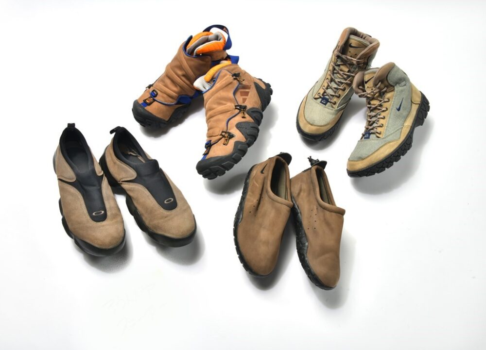 (左上)アウトドアスニーカーの中で異彩を放つ存在がアディダスのバットランダー。こちらは’99年製(2000年発売)のデッドストックをソールリペアしたもの。10万円8680 円(ダンジルTEL042-720-8703)(右上)アッパーにヘンプ素材を採用した’95年製ナイキACGのザイオン。デッドストック。2万1780 円(デザートスノー 千葉TEL043-225-9600)(左下)2000年代に登場したオークリーのフレッシュ。昨年ブレインデッドとコラボして復刻した事で人気が過熱。これは当時のオリジナルモデル。5万4780円(MUD TEL03-5738-8877)(右下)1994 年に登場し、スニーカーの概念を変えたナイキACGのエアモック。こちらは1999年製のモカカラー。9790円( バックストリート TEL042-720-0355)