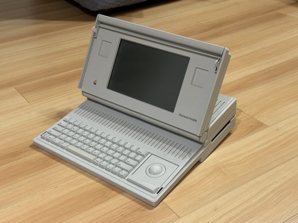 ハンドルが取り付けられ、Macintoshシリーズとしては初めてバッテリー駆動に対応したのがこのPortable。純正採用されたトラックボールは10キーと入れ替えたり、キーボード全体との左右位置変更もできるので、左利きにも対応した。