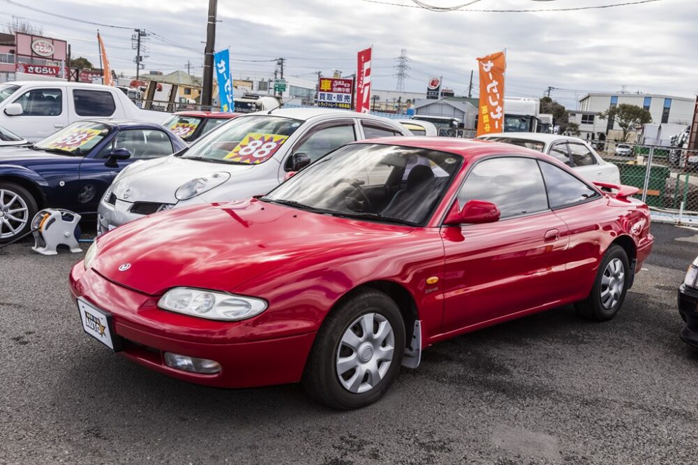 2023年2月時点、カーセンサーでこのクルマを調べると、現存しているのはバクヤスオートのこの個体のみというまさに絶滅危惧種なマツダ製スペシャリティカー。ノッチバックの2ドアクーペは写真ではコンパクトに見えるかもしれないが、全幅1750㎜という当時にしてはワイドなシルエット。そして最大のポイントは200馬力を発揮するV型6気筒DOHC2500㏄エンジンを搭載している点。日本ではイマイチ影の薄かったMX-6だが、海外では高い評価を得ていたというのも当時のマツダらしいエピソードだ。68万円