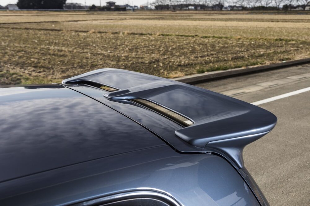 リアに装着された大型のテールスポイラー。エアスクープの形状から空力特性が考えられているのがわかる。もちろん標準パーツだ。