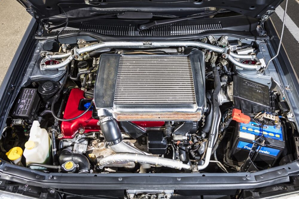 直列4気筒2000ccターボのSR20DETを搭載。エンジンはノーマルのままだが、当時のオプションであるニスモのタワーバーを装着している。