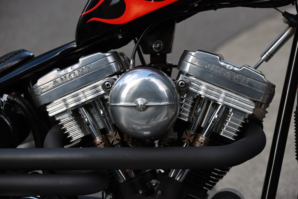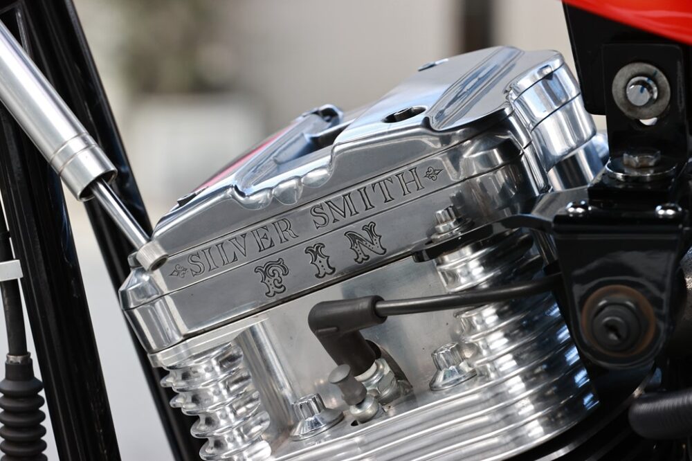 T-man performance製のビレッドアルミシリンダーヘッドを搭載。スポーツスター用のロッカーカバーを装着し、彫金を施している。