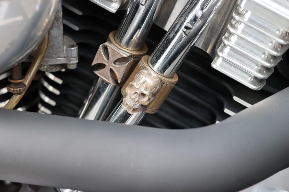 エンジンのプッシュロッドカバーを装飾するオリジナルのブラスカップ。スカルやマルチーズクロスなどのモチーフをあしらっている。
