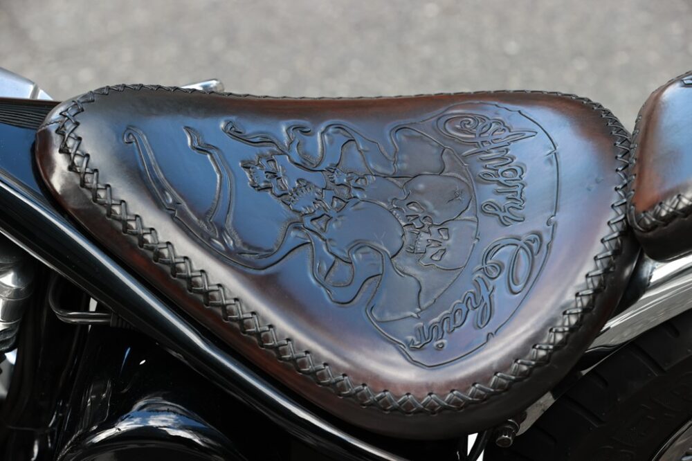 シングルタイプのポールコックス製サドルシート。スカルのカービングやサイドのレース編みなどが施され、装飾性が高い逸品。