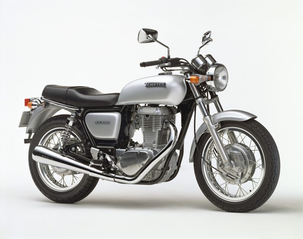 ’97年に発売されたテンプター。その名は「誘惑する者」という意味。直立したOHCエンジンはキック式ではなくセルモーター式。前後ドラム式ブレーキを採用し、テイストに重きを置いた一台だ。