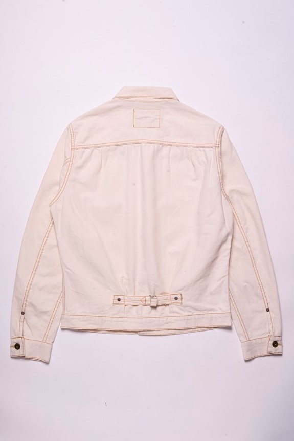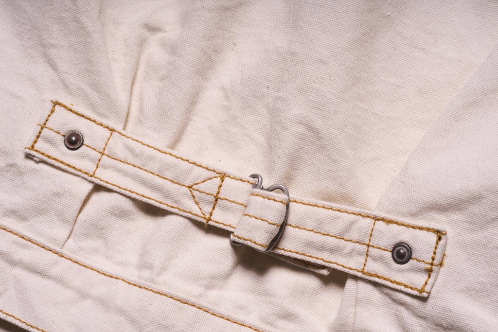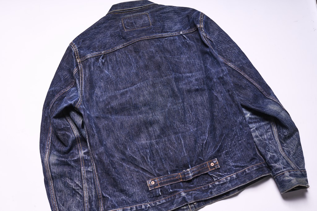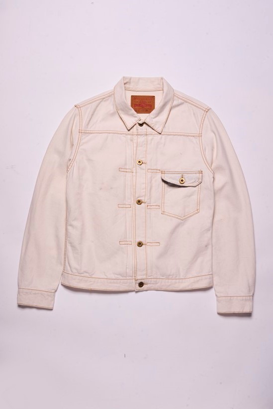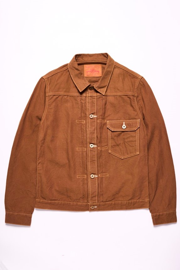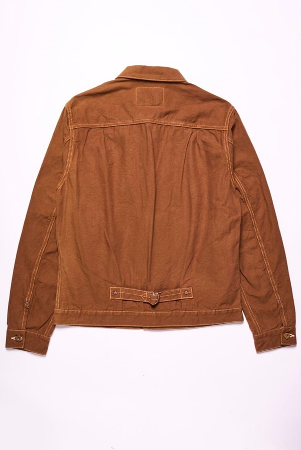 旧式の狭幅シャトル織機で織り上げたダックを使用したジャケットは、いわゆる戦前のワークウエアを彷彿させるクラシックな仕上がり。染色は硫化染料を採用することで、デニム同様、経年変化が楽しめるのもこのジャケットの大きな特徴となっている。2万3100円