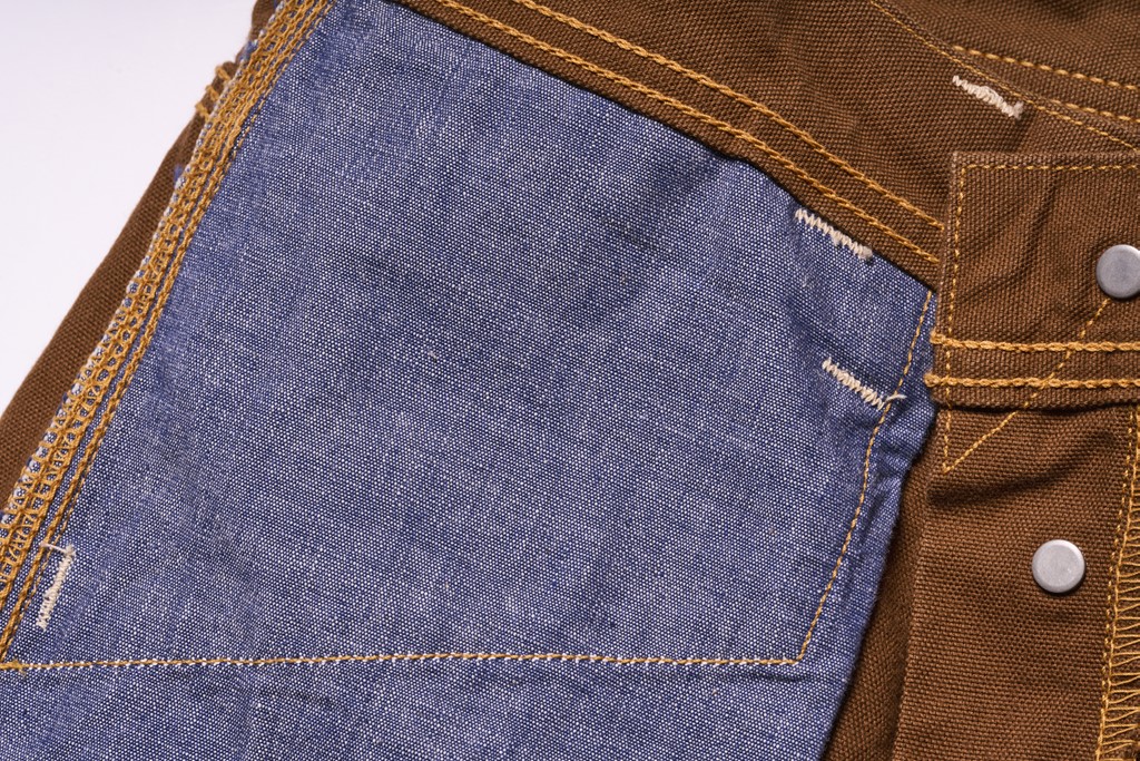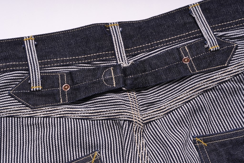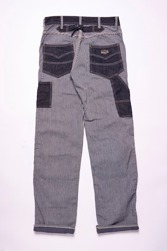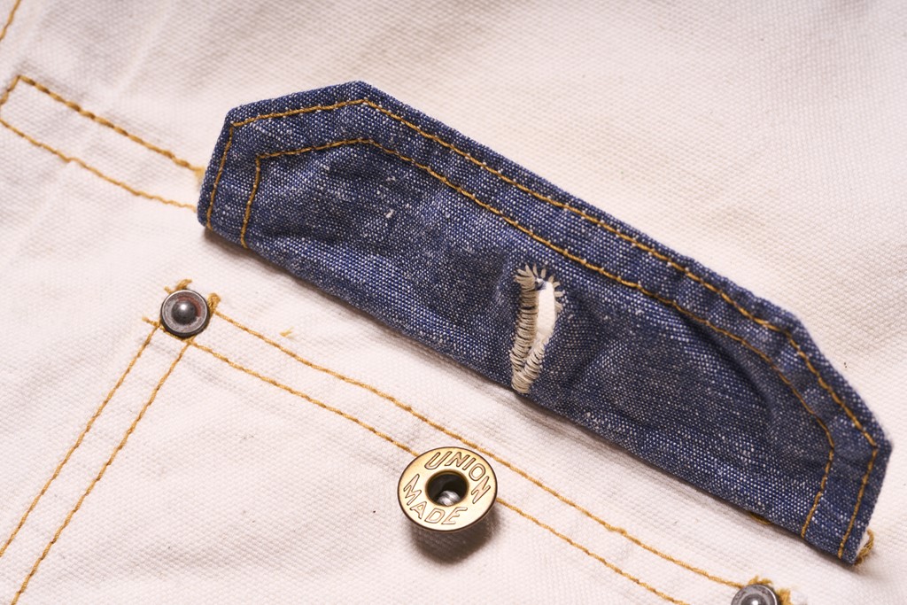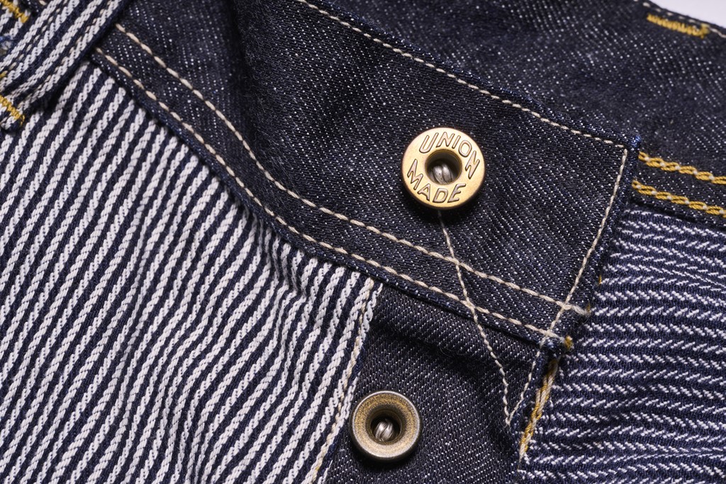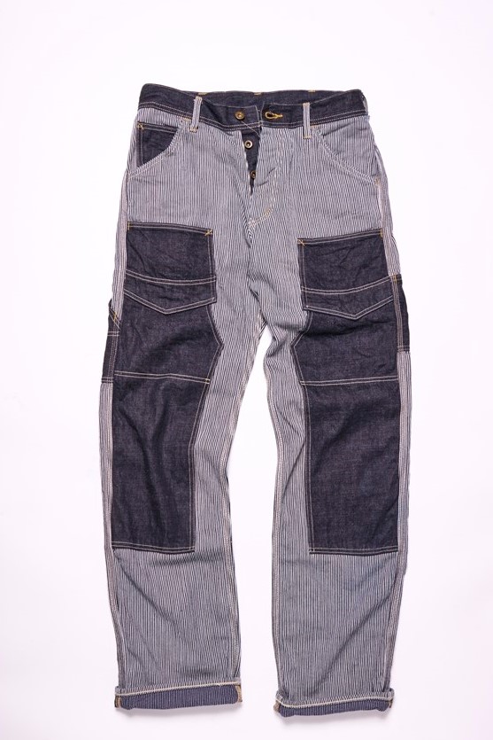 ヒッコリーとデニムをクレイジーパターンで合わせたダブルニーワークパンツ。圧倒的なインパクトはもちろん、バックシンチやトップボタンに「UNION MADE」のボタンを使用するなど、ヴィンテージウエアらしいディテールが盛りだくさんな仕上がりとなっている。2万2000円