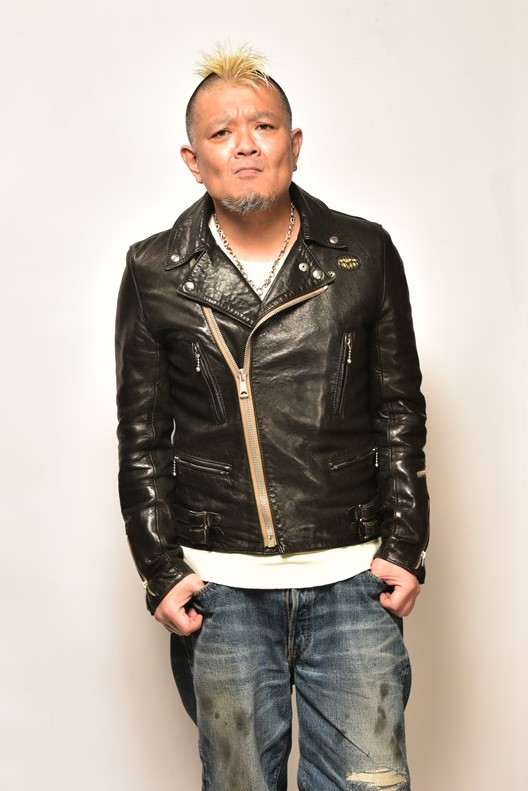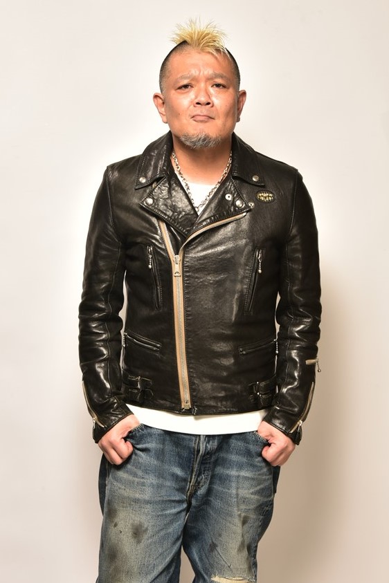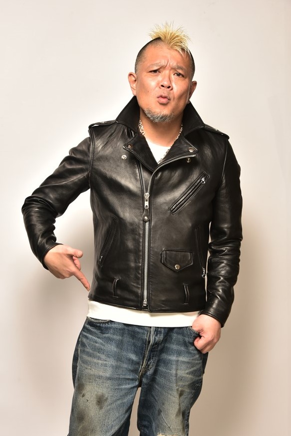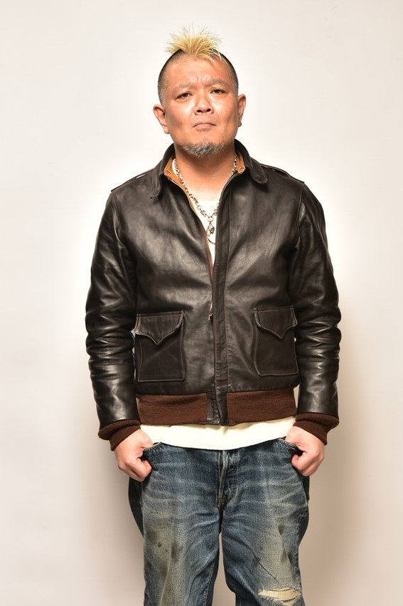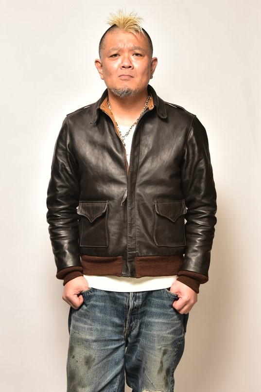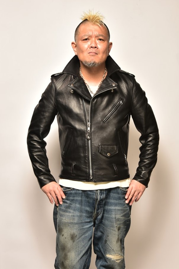 モヒカン小川愛用の革ジャンとハイウェイナインを実際に合わせてみた。身長175㎝・体重72㎏のモヒ小川は、リブTシャツのLサイズをチョイス。革ジャンはA-2、ショット・ワンスター217(シープスキン)、ルイスレザーズ・ライトニング。どう? 着丈完璧じゃね?