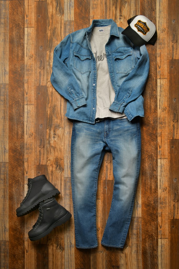 王道だが意外と難易度の高いデニム・オン・デニムも横濱デニムの細身テーパードなら大人のアメカジスタイルに。