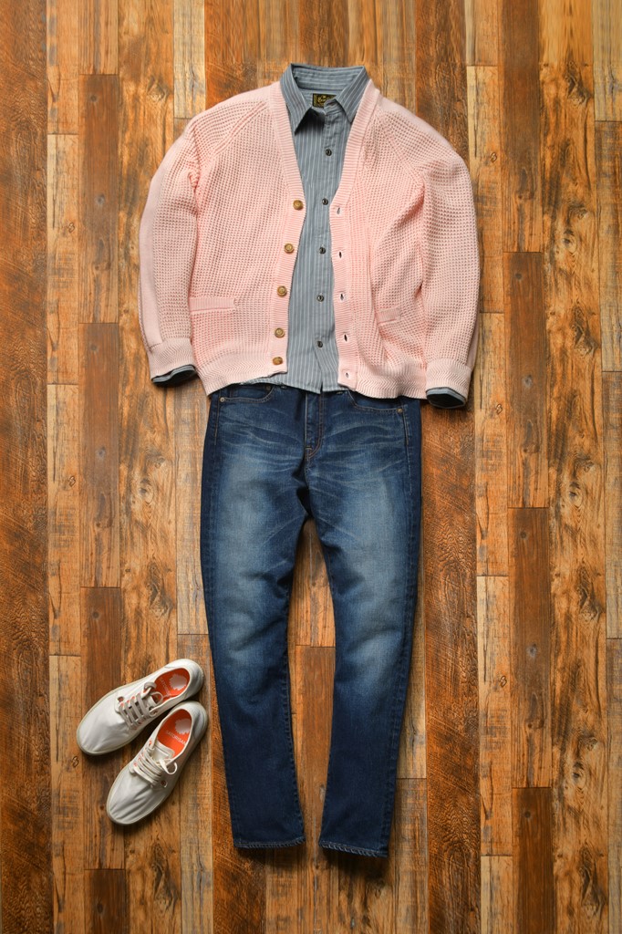 インディゴを強めに残したユーズド加工だが、細身のスリムテーパードのためハードな印象はなく、トップスにはピンクやサックスといった淡い色も合わせやすい。1万9900円