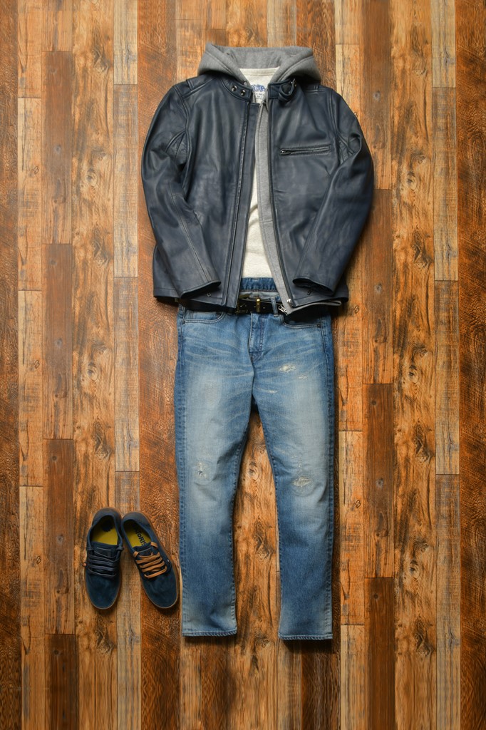 革ジャンなどの上級者アイテムでも、美脚&足長シルエットの横濱デニムなら体格など関係なく誰にでも着こなせる。