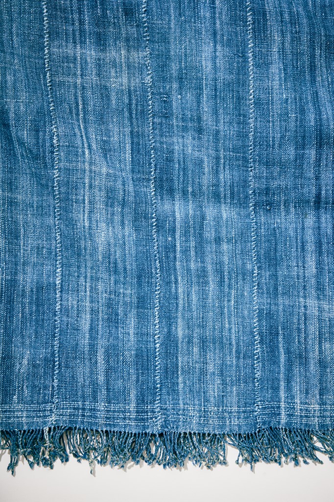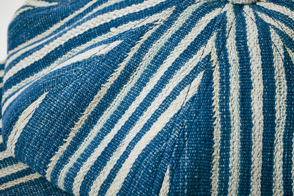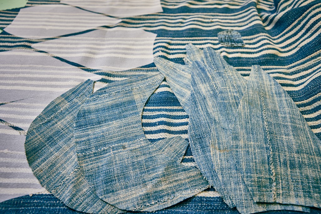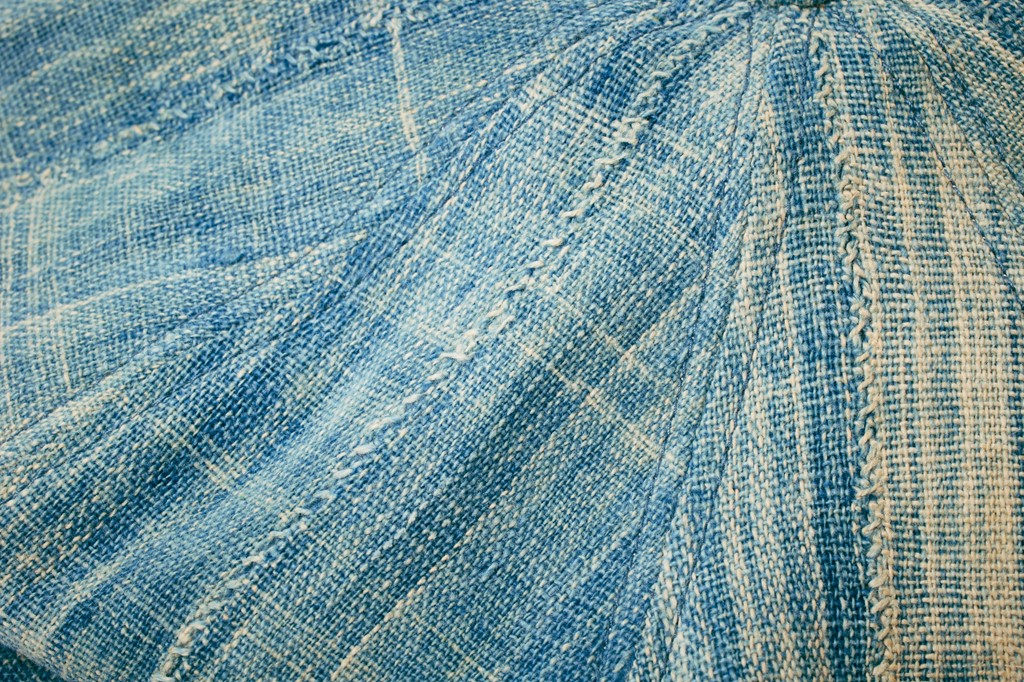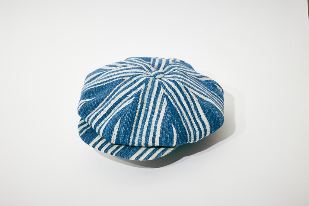 こちらは希少なブルキナファソのモシ族のインディゴ染めストールを使ったキャスケットを制作中。8枚のパーツを接いでクラウンに仕上げていく工程の一葉。
