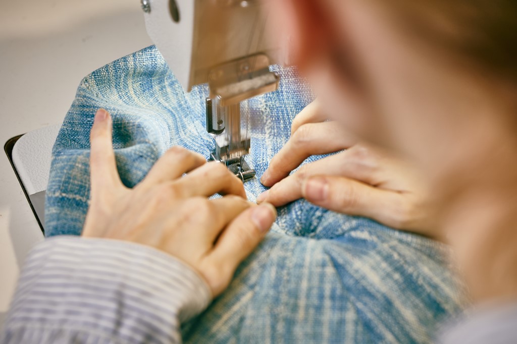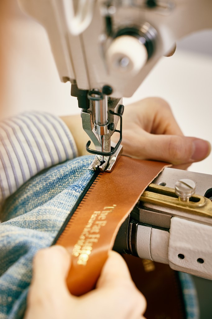 あまりに希少な生地のため、無駄の内容に丁寧にパターン取りして裁断。それをひとつずつミシンで縫製していくのだ。