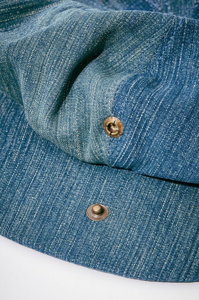 実はツバとクラウンのフロント中央にスナップボタンが隠れている。4つ割れのヴィンテージ仕様でエイジング加工済みで、ヴィンテージ生地との風合いも抜群。