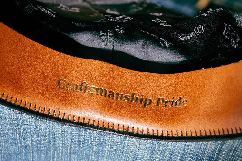 「スベリ」と呼ばれる帽子の被り口の裏部分のレザーを、欧米式の” Iステッチ”で縫製している一葉。この縫製をできるのは、日本ではファットハッターだけ。